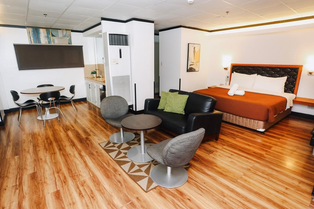 Perfect for weddings and special events, the Junior Suite offers direct access to The Hive Hall. It features a King-sized premium chiropractic mattress, a spacious living area, and a convenient kitchenette for a relaxing and enjoyable experience.